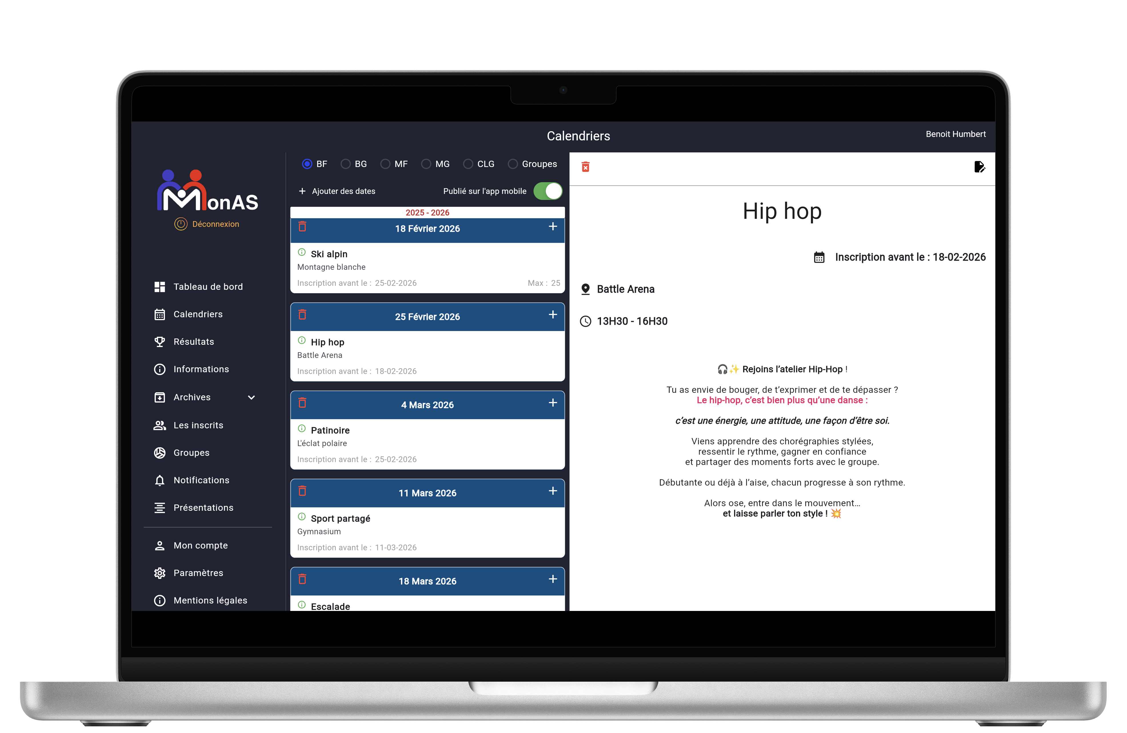 En quelques clics, tu publies toutes les infos importantes (lieu, horaires, compétitions, convocations…).